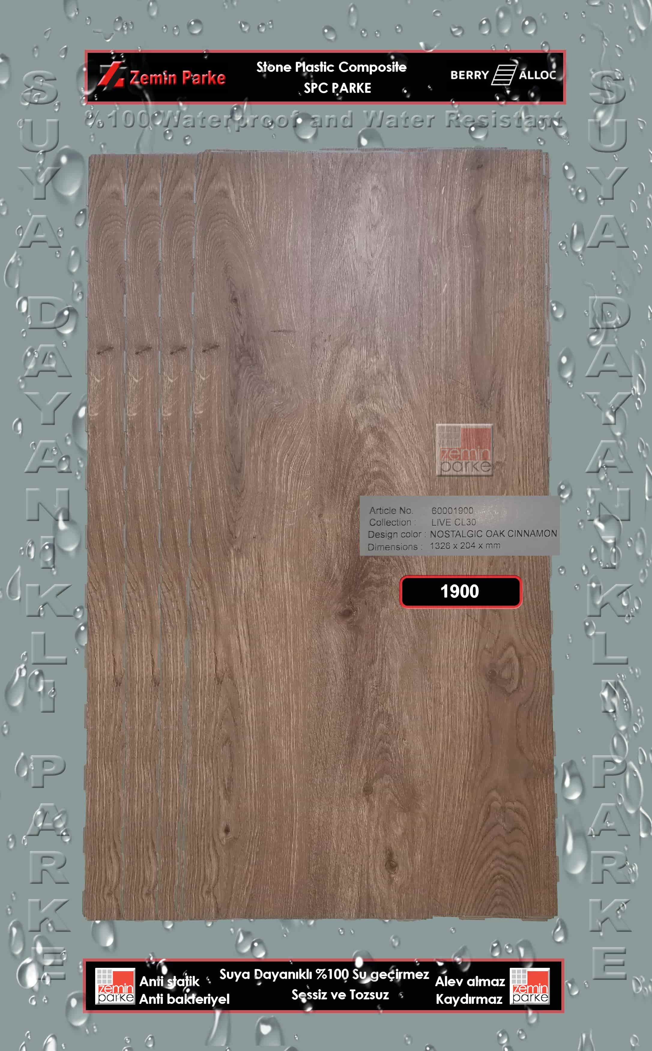 Belçikadan ithal... SPC yani Stone Plastic Composite dediğimiz beton-plastik karışımı vinil bazlı ve % 100 suya dayanıklı Parke... BerryAlloc Live CL30 SPC Nostalgic Oak Cinnamon 1900 Suya Dayanıklı Parke